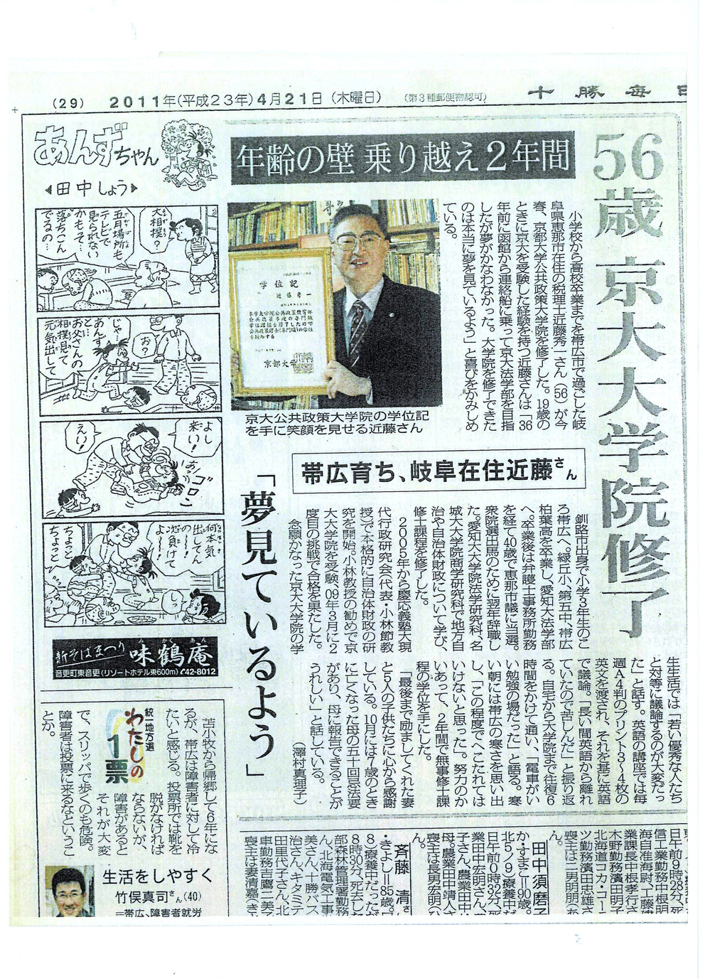 遠距離の通学、膨大な課題に苦労しながらも、何とか56歳で卒業でき、いくつかの新聞にも紹介していただきました。(次ページ)